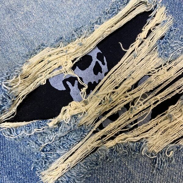 4箇所のクラッシュパーツには、デザイン布パッチで下地縫製(リペア加工)しております。