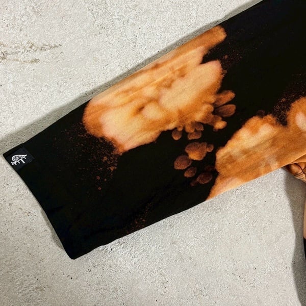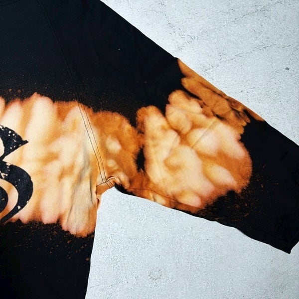 SMACK ENGINEERのBAN氏が光と影をイメージし、手作業で一着ずつブリーチ加工を施した綿天竺素材のルーズシルエット7分袖です。