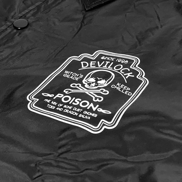 DEVILOCK デビロック「DEVILOCK POISON COACH JACKET」コーチジャケット ジャンパー ウインドブレーカー トラックジャケット ナイロン 軽量 黒 ブラック バックプリント ロゴ スカル ドクロ メンズ レディース パンク ロック PUNK ROCK バンド フェス ステージ衣装 Rogia