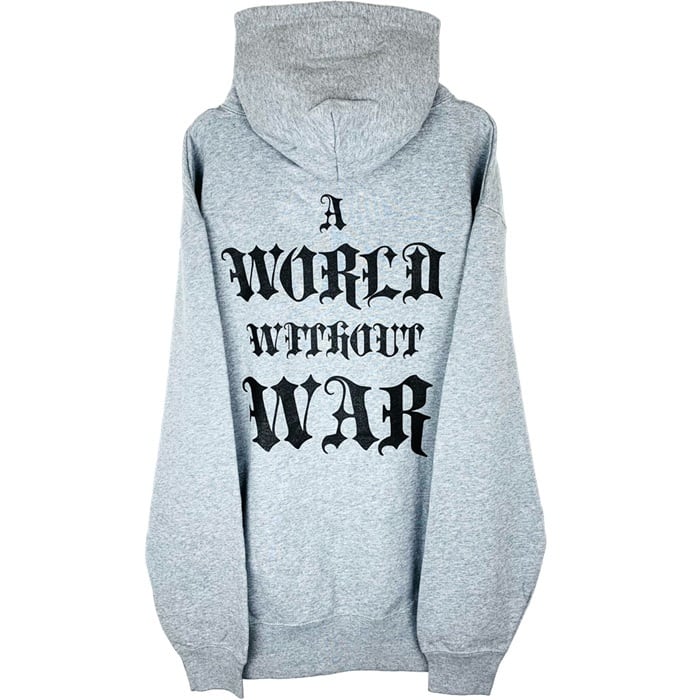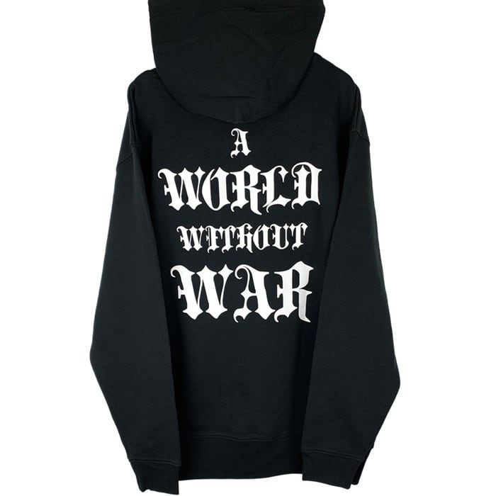 新作『A WORLD WITHOUT WAR』をバックに大きくプリントしたフーディー。