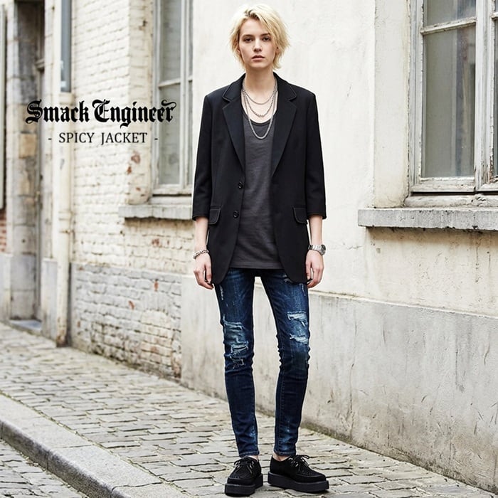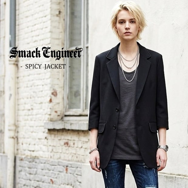 【50%OFF SALE】SMACK ENGINEER / スマックエンジニア「SPICY JACKET」テーラードジャケット 七分袖 ストレッチ 黒 ブラック メンズ レディース スカル ドクロ スペード 2ボタン 背抜き ミュージシャン ファッション PUNK ROCK パンク ロック バンド ステージ衣装 Rogia