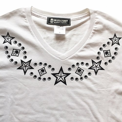 SKULLSHIT / スカルシット「Studs Star V-Neck T-sh」[渋谷龍太(SUPER BEAVER)&坊屋春道(クローズ)着用モデル] 半袖Tシャツ Vネック スター 星 ドクロ メンズ レディース 黒白 ブラック ホワイト ロック パンク ROCK PUNK 骸骨祭り ラッピング無料 ステージ衣装 Rogia