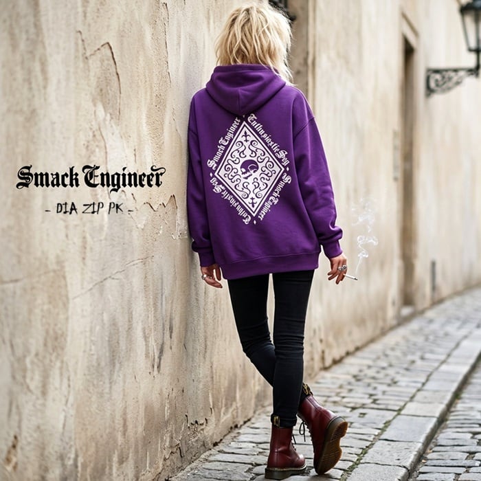 SMACK ENGINEER / スマックエンジニア「Rogia限定 DIA ZIP PK」ジップアップパーカー 裏パイル ミニ裏毛 黒ブラック グレー 緑グリーン 紫パープル バックプリント スペード ダイヤ スカル ドクロ メンズレディース PUNKROCK パンクロック バンド フェス ステージ衣装 Rogia