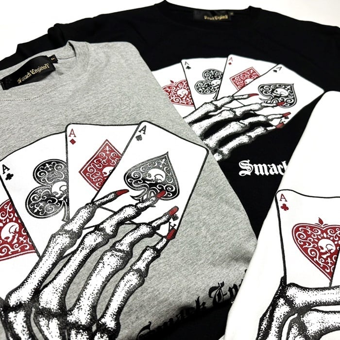 SMACK ENGINEER / スマックエンジニア「Rogia限定 LAST PLAY BIG TEE」ビッグTシャツ オーバーサイズ 半袖 五分袖 黒 白 ブラック ホワイト グレー スペード ダイヤ ハート クローバー スカル ドクロ メンズレディース PUNK ROCK パンクロック バンド ステージ衣装 Rogia