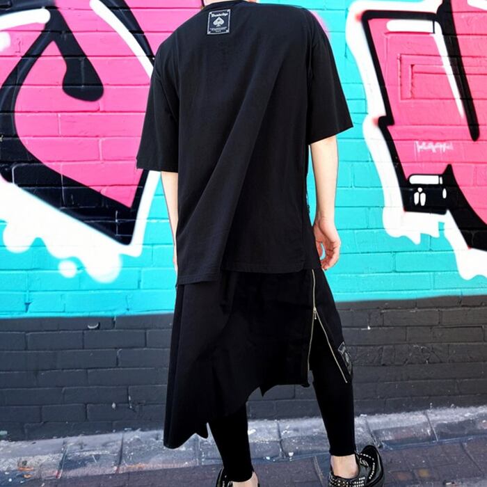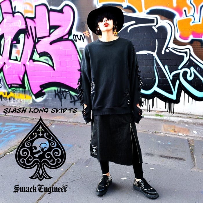 SMACK ENGINEER / スマックエンジニア「Rogia限定 SLASH LONG SKIRTS BK」男女兼用ロングスカート ラップ 巻きスカート アシンメトリー 黒 ブラック ジップ ジッパー ウエストゴム スペード スカル メンズレディース PUNK ROCK パンクロック バンド V系 ステージ衣装 Rogia