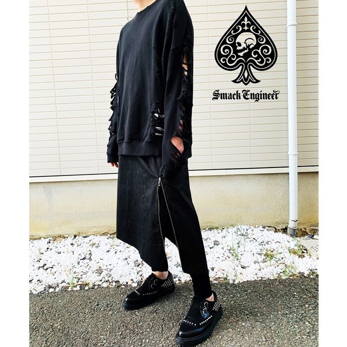 SMACK ENGINEER / スマックエンジニア「Rogia限定 SLASH LONG SKIRTS ST」男女兼用ロングスカート ラップ 巻きスカート アシンメトリー 黒 ブラック ストライプ ジップ ジッパー ウエストゴム スカル メンズレディース PUNK ROCK パンクロック バンド V系 ステージ衣装 Rogia
