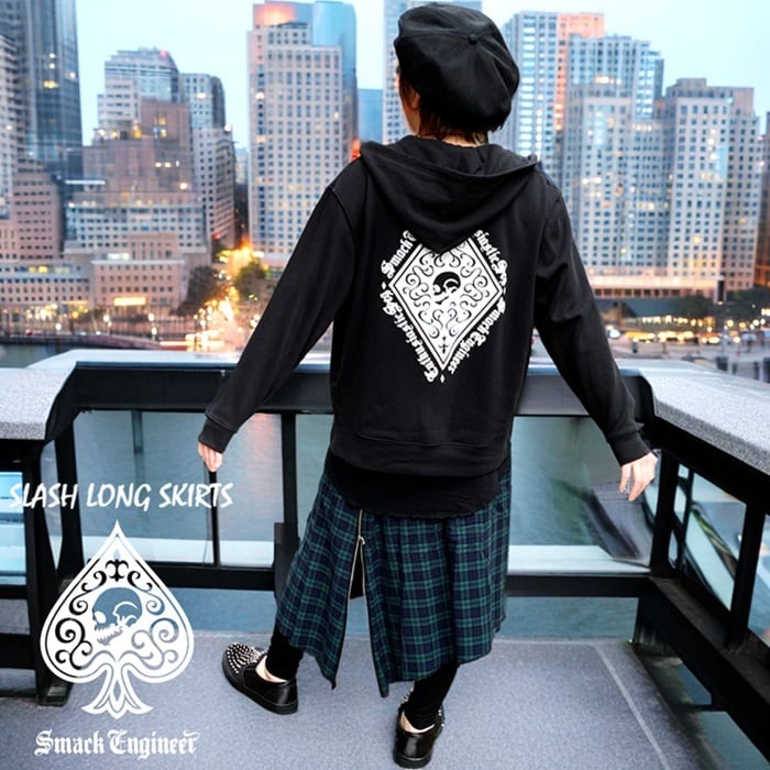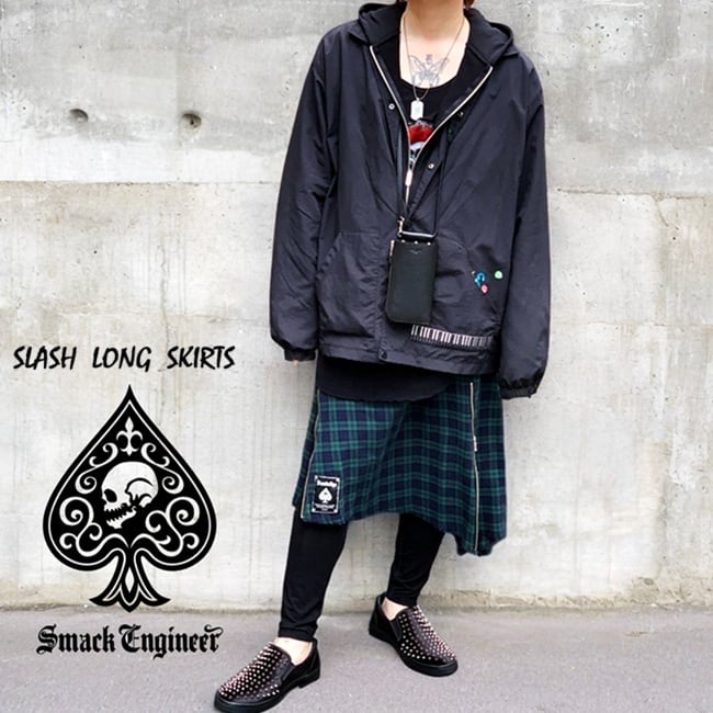 SMACK ENGINEER / スマックエンジニア「Rogia限定 SLASH LONG SKIRTS GN」男女兼用ロングスカート ラップ 巻きスカート アシンメトリー 緑 グリーン タータンチェック ジップ ジッパー ウエストゴム メンズレディース PUNK ROCK パンクロック バンド V系 ステージ衣装 Rogia