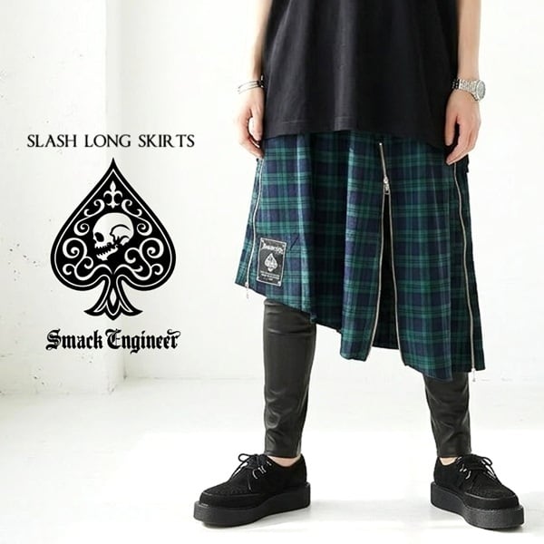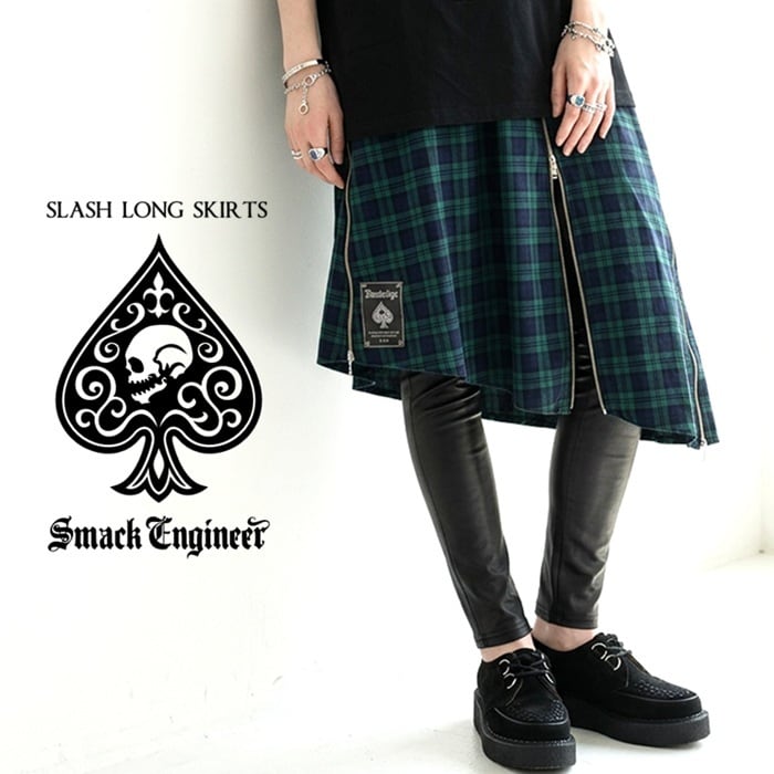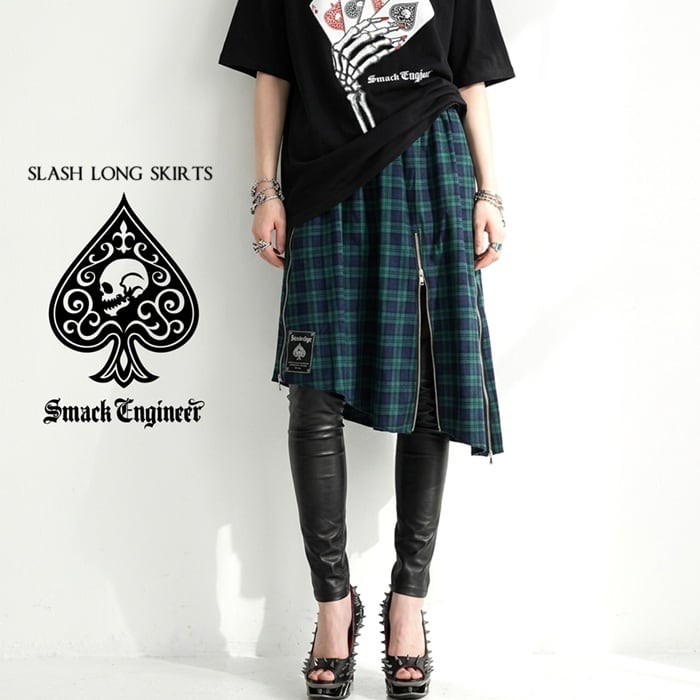 SMACK ENGINEER / スマックエンジニア「Rogia限定 SLASH LONG SKIRTS GN」男女兼用ロングスカート メンズスカート ラップ 巻き アシンメトリー 緑 グリーン タータンチェック ジップ ジッパー ウエストゴム レディース PUNKROCK パンクロック バンド V系 ステージ衣装 Rogia